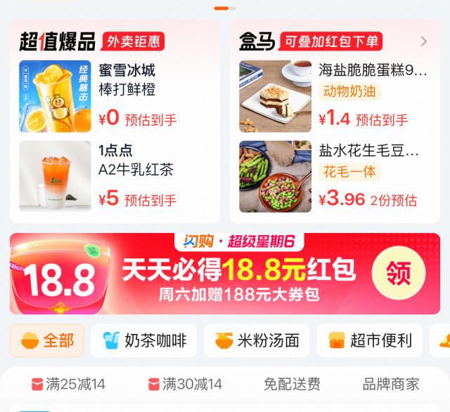记者注意到,"超级星期六"活动页面有一张满 58 元减 18.8 元的红包可领。此外,淘宝闪购还有 188 元大券包活动,分别在早餐、午餐、下午茶、晚餐以及夜宵五个时段,有不同额度的外卖红包可领,但均并非此前的" 0 元购"奶茶活动。