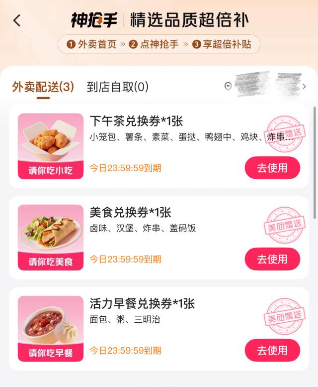 7 月 19 日,北京的消费者李女士告诉记者,上个周六,在美团页面打开就能显示的"您的 0 元外卖已到账"的提示栏已经消失,取而代之的是"您的外卖好礼已到账",点进去,李女士顺利领到了"活力早餐""下午茶"和"美食"三张免费通兑券。