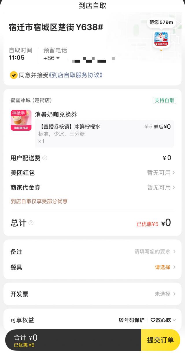 以北京为例,打开美团 App 可以发现,虽然上个周六最显眼的" 0 元购"广告栏提醒已经消失,但消费者普遍还能领取到免费通兑券。淘宝闪购的"超值爆品"里,依然能看到"预估到手 0 元"的蜜雪冰城个别单品。