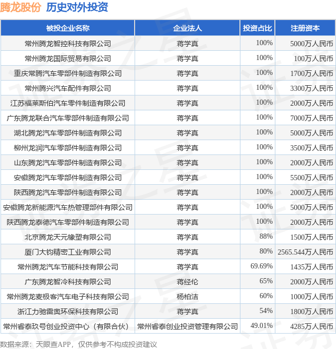 本站消息,根据天眼查APP显示,腾龙股份(603158.SH)新增一起对外投资事件赢在策略,被投资公司为常州腾龙智控科技有限公司,法定代表人蒋学真,投资占比为100%。该公司从事科技推广和应用服务业,注册资本为5000万人民币。目前,腾龙股份共存在对外投资26项,投资占比前20的项目见下表: