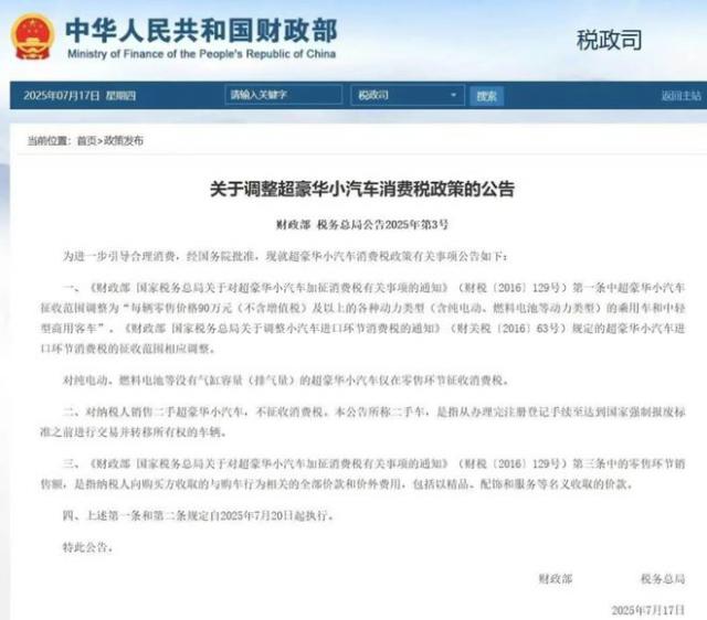 7 月 17 日,财政部、国家税务总局公告,调整超豪华小汽车消费税政策,新规自 7 月 20 日起执行。其中提到,超豪华小汽车征收范围调整为"每辆零售价格 90 万元(不含增值税)及以上的各种动力类型(含纯电动、燃料电池等动力类型)的乘用车和中轻型商用客车"。