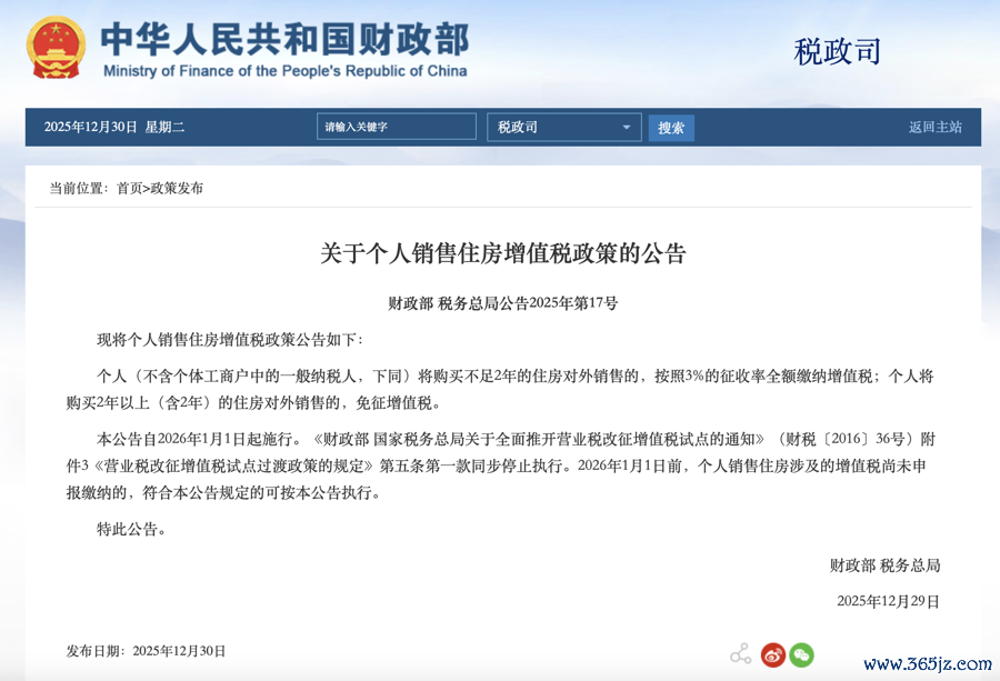 12月30日晚间,财政部网站发布了《关于个人销售住房增值税政策的公告》(以下简称《公告》),明确自2026年1月1日起,不足2年的住房对外销售,房东需缴纳的增值税从5%降至3%。这一关键税率的下调,对降低房屋交易成本和楼市去库存都是利好消息。