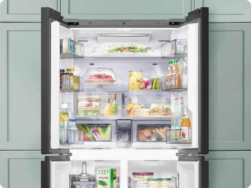 夏季食材丰富多样,开关冰箱拿放食材的频率也更高,要全方位保障家人的饮食健康,冰箱的保鲜能力与抗菌效果自然不容忽视。三星AI神 冰箱9系采用立体环绕式制冷,实现冷藏、冷冻层层均匀送风,多维立体冷流让冷藏室的瓜果蔬菜、冷冻室的冰淇淋与水产都能更好保鲜,保留原始口感,冷藏室的金属速导冷设计还可对果蔬、鲜奶等食品严格控温,频繁开门的场景下也能高效续冷、锁住营养。