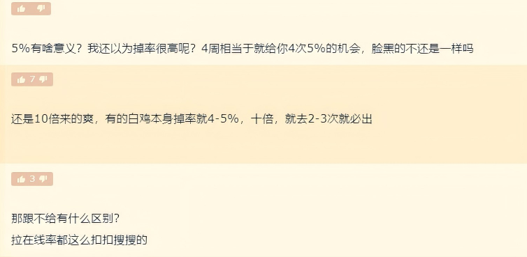 所以,很多玩家都有怨言:“还是10倍来的爽,有的白鸡本身掉率就4-5%,十倍,就去2-3次就必出”,“5%有啥意义?我还以为掉率很高呢?4周相当于就给你4次5%的机会,脸黑的不还是一样吗”,“不知道我28个满级号够不够用”……
